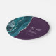 These elegant modern wedding plates feature a teal watercolor design trimmed with faux silver glitter. Easily customize the silver gray text on a purple background, with the names of the bride and groom in handwriting calligraphy over a large ampersand.