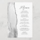 This elegant modern wedding menu features a grey and white watercolor agate border trimmed with faux silver glitter. The customizable text combines charcoal grey handwriting script and sans serif fonts on a white background. The agate design is repeated on the reverse side.