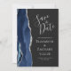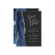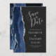 This elegant modern save the date card features a navy blue watercolor agate border trimmed with faux silver glitter. The customizable text is light silver grey on a dark charcoal grey background. The reverse side features a matching navy blue and silver agate design.