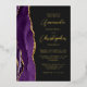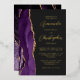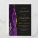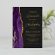 The left-hand edge of this elegant modern wedding invitation features a purple watercolor agate border trimmed with faux gold glitter. The customizable text combines script and sans serif fonts in real gold foil on a dark background. The reverse side features a matching agate design.