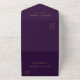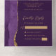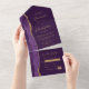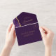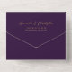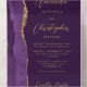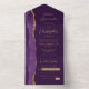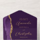 The left-hand edge of this elegant modern all-in-one wedding invitation and RSVP features a purple watercolor agate border trimmed with faux gold glitter. The customizable text combines gold-coloured stylish calligraphy script and sans serif fonts on a plum background. The return address appears on the outside flap and the reverse side of the detachable RSVP card in gold-coloured text on solid plum.