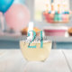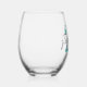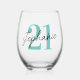 Personalized birthday stemless wineglass featuring the persons age in a teal blue, which can be changed to any colour, and their name in a elegant script font.