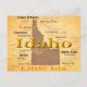 Aged antique paper Idaho state pride image including map silhouette with cities, towns and nickname.