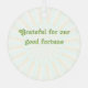The text reads "It takes 2 to Q" the dog is clearing the last dog agility hurdle, the jump bar is up and the handler has arms raised in celebration. Fun in dog agility is being the team and maybe achieving a qualifying score (the Q). Keep the image shown, or upload your pet's photo at the prompt for a beautiful and personal ornament. On the back is "Grateful for our good fortune" You can keep the existing text, or replace it.