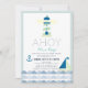This cute and modern "Ahoy, It's a Boy" baby shower invitation features a lighthouse in light tuiquoise blue and navy blue, sailboat, anchor with blue waves on a white background framed by a light turquoise blue border. The reverse side features a navy blue background with navy blue rope patterns. Personalize for your needs. You can find more matching products at my store.