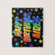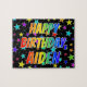 This exciting, vibrant, birthday-themed jigsaw puzzle design features the message "HAPPY BIRTHDAY, AIDEN" with the characters having a colourful rainbow spectrum inspired gradient pattern, in addition to a lively field of stars background pattern. An exciting puzzle like this might be a fun way to send birthday wishes to somebody named Aiden. [~Z0000468]