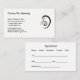 Accessoires auditifs cartes de visite et modèle de rendez-vous combinés conçus avec un logo d'oreille que vous pouvez utiliser sur nos cartes ou remplacer par votre propre logo d'entreprise. Une mise en page classique vous permet de customiser le design de votre façon pour une clinique auditive, Ear Doctor aussi connu comme un audiologiste, ou un magasin d'appareils auditifs.