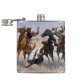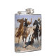 This is a wonderful image by famous cowboy artist Frederic Remington, called Aiding A Comrade. It depicts two mounted cowboys coming to the aid of a third cowboy caught up in the stirrup of his bucking bronco. This is a scene that played out many times in the old American West. Remington was a master at capturing the action of this historic time. This is one of his more famous paintings, and the image is now in the public domain for all to enjoy. The image and text are placed on a light blue grey background. The back of the flask depicts the title and artist, and has a field for your name.