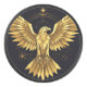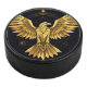 Une image étonnante d'un aigle géométrique doré, au design complexe, aux ailes écartées, positionné contre un arrière - plan sombre abstrait aux motifs mystiques. Idéal pour les thèmes de force, de pouvoir et de liberté.