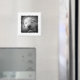 Photo en noir et blanc d'un chiot de 10 jours des Grandes Pyrénées sur un aimant carré.