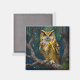 A beautiful magnet with a gold and blue owl sitting on a tree branch. This illustration has an impasto oil painting style.