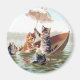 OEuvre vintage de petits chatons qui ont emmené leur bateau dans le lac et ont subi un accident de navigation. Un chat reste assis dans le bateau tenant un parapluie frileux tandis que les trois autres remontent.