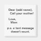 Maman, un fils et sa fille vont à l'université ? ou sortent tout seuls pour commencer leur voyage ? ou quel que soit le coque ? Cela ferait un bel aimant pour un cadeau pour ce fils ou cette fille pour leur rappeler d'appeler chez eux, comme il est dit Cher___, appelez votre mère! Amour, Maman p.s. un message texte ne compte pas. Ce message peut être de n'importe qui n'a pas besoin d'être seulement de maman il pourrait être de n'importe qui aimé. Changez juste de nom après appeler votre___ et l'amour,___. Cependant, je préférerais prendre le temps de mettre un mot ou une expression significatif pour quelqu'un, à sa demande, plutôt que de les faire régler sur quelque chose que j'ai choisi. Je veux qu'il soit spécial pour le client et qu'il ait un sens pour eux ou pour celui à qui il le donne. Si l'une de mes pièces vous parle, merveilleux, mais s'il y a quelque chose de spécifique que vous voulez, faites-le-moi savoir et je le ferai pour vous !" Vous pouvez me contacter par e-mail via mon magasin. MsLoriNY@aol.com