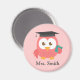Express merci et reconnaissance à votre merveilleux professeur avec cet aimant mignon qui a un hibou professeur de dessin animé qui porte un professeur casquette et tient un livre dans ses ailes. Le hibou est adapté parce qu'il représente la sagesse et la connaissance. Rose pastel pour arrière - plan. Personnalisez avec le nom de l'enseignant.