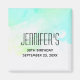 Aimant d'anniversaire avec une bordure abstraite le long du dessus avec des couleurs tourbillonnant vertes et bleues. Un design doux et estival. Une lumière croise la texture derrière l'image.