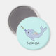 Un narval arc-en-ciel nage dans la mer avec espace pour un nom personnalisé sur un aimant rond.