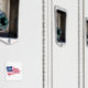 Image stylisée du drapeau américain avec le symbole de l'atome athée dans le champ bleu où les étoiles seraient.