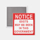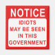 Cette note amusante est juste la chose pour votre réfrigérateur. Disponible sur d'autres produits, cet aimant frigo est en forme de panneau et dit : AVIS, DES IDIOTS PEUVENT ÊTRE VUS DANS CE GOUVERNEMENT. - Un drôle de signe politique qui dit l'évidence! Super à envoyer au premier ministre et à d'autres politiciens. Je suis sûr qu'ils vont rire !