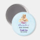 Un baby shower merci aimant avec une jolie peinture d'aquarelle d'un lion mère tenant son bébé. Un joli bouquet fleuri violet en contrebas ajoute une touche de douceur à cette image douce et adorable. arrière - plan bleu clair.