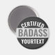 Créez votre propre cadeau amusant pour un membre de la famille, un collègue ou un ami avec un aimant rond "Badass Certifié" personnalisable. Le libellé de ce modèle est simple à personnaliser, et toutes les couleurs et les polices peuvent être customisées à l'aide de l'outil de design Zazzle. Le design de bannières en noir, blanc et gris présente une citation humoristique imprimée avec une typographie moderne et audacieuse. Il fait une idée cadeau unique et élégante de keepsaké pour le badass dans votre vie.