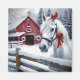 Joli cheval blanc avec un arc rouge et cardinal sur la tête. L'Arrière - plan a une grange rustique rouge avec des couronnes de Noël. Une jolie scène d'aquarelle d'une journée d'hiver enneigée à la ferme.