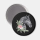 Noir sur aimant noir avec une belle illustration d'une tête de cheval noir avec un embellissement floral fantaisie par son cou. Peinture animale élégante et classe.