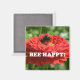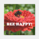Cute message to "bee happy" with a busy bumble bee collecting pollen from a bright red flower.