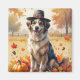 Un tableau aquarelle d'un chien gai assis au milieu d'un tas de feuilles d'automne vibrantes, entouré de minuscules citrouilles et de glands épars. Le chien porte un petit casquette pèlerin et des poutres de joie, capturant l'esprit de Thanksgiving. Dans l'arrière - plan, les champs de moissons et les arbres dorés créent une ambiance campagnarde paisible. Des textures douces et des tons d'automne chauds et feutrés confèrent à la scène une atmosphère cosy et nostalgique parfaite pour célébrer la beauté de la saison.