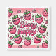 This adorable design features cute cartoon strawberries with smiling faces, arranged playfully. The word "Happy" is displayed in a whimsical font, adding a touch of humor and happiness. The kawaii style and light pink background create a sweet and delightful feel.
