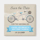 Les mariages de bicyclettes sont une nouvelle tendance amusante dans les mariages thématiques. Sur ce faux arrière - plan de lin, sauvez l'aimant de date, un vélo tandem symbolise le couple marié à être. Le siège de la mariée est revêtu d'un voile mariage. Le marié dispose d'une cravate à arc dénoué enroulée autour du guidon avec le bouquet nuptial dans le panier de la moto. Les noms du couple se détachent sur une bannière bleu ciel ci-dessous. Idéal pour un vélo ou un mariage extérieur. Disponible en couleurs alternatives avec une option vélo tandem.