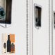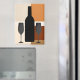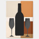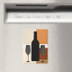 Les silhouettes d'une bouteille de vin et de deux verres à vin sont superposées à des blocs de couleur brun, beige et bronzé sur cet aimant de cuisine moderne et design.