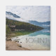 Aimant photo souvenir avec un paysage avec un cabine en bois au bord du lac Bohinj avec le reflet de la forêt avec des arbres en automne couleurs dans l'eau calme du lac près de Bled en Slovénie avec le texte 'Bohinj, Slovénie'.