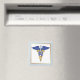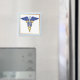 Cette canette de soins infirmiers présente des serpents dorés jumelés autour d'un personnel bleu clair avec des ailes bleues plus profonds et une grande lettre N.