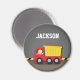 Design met en scène un mignon petit garçon de chantier dans un gilet de sécurité casquette et orange conduisant une benne rouge. Le design est traité avec un effet d'ombre qui rend le design pop. Un motif à rayures jaunes et noires dans l'arrière - plan qui se trouve couramment dans les zones de construction et les sites Idéal pour les garçons qui aiment les véhicules de construction et les jouets de camion! Personnalisez avec le nom de l'enfant pour le rendre spécial!