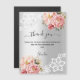 Un arrière - plan faux argenté. Décoré de roses roses roses, de fleurs et de dentelle blanche. Script écrit à grande main avec des swashes et le texte : Merci. Personnalisez et ajoutez la note de remerciement et le nom.