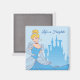 Cendrillon dans sa robe bleue avec la silhouette du château en arrière - plan.