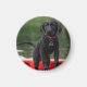 Un imán decorativo con la imagen de un perro negro mojado.