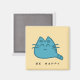 un dessin animé mignon d'un chat kitty souriant bleu avec "soyez heureux" écrit en dessous.
