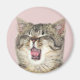 Brown chaton à table avec sa bouche ouverte dans une grande langue de curling yawn, ou peut-être qu'il vous chante, aimant photo.