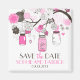 Un joli et fantaisie illustrant des jarres de mason rose chaud et taupe, des tourterelles, des fleurs et des cordes de coeur, le tout perché sur des branches d'arbres. Ce jeu amusant et romantique sauvez l'aimant de date est parfait pour un mariage d'été ou de printemps.