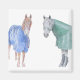 Crayon couleur illustration d'un poney de châtaignier et d'un cheval gris portant leurs tapis de participation néo-zélandais.