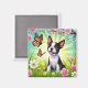 Une représentation délicieuse d'un joyeux chiot de boston terrier entouré de fleurs en fleurs, de papillons vibrants et d'un soleil éclatant dans une prairie extérieure animée. Elle incarne parfaitement la joie, la nature et la magie du printemps.