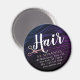 Modèles de magnets personnalisés pour Salon de coiffure / Coiffeur / Coiffeuse / Salon de beauté / Maquilleurs / Organisateurs de ciseaux / Organisateurs d'événements / Conseillers / Propriétaires de boutiques / Fashionistas - Ciseaux modernes en faux or rose sur un élégant fond de motif de cheveux noir et violet.