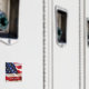Un beau drapeau américain avec des rayures rouges blanches et bleues brandissant dans le vent avec personnalisable patriotique motivation citations modèle texte.