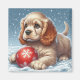 Un charmant chiot à cocker spaniel se trouve sur une surface enneigée tenant une boule rouge festive ornée de flocons de neige.