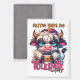 A funny, sarcastic, and colorful design showcases an adorable highland cow clutching a takeout coffee cup. The cup features a coffee bean and a black lid. The cow, with its big blue eyes and black-and-white fur, adds charm to the design. The vibrant text reads, "Coffee helps me tolerate idiots." This design is available on various products, making it a perfect gift for coffee lovers.