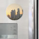 Un aimant photo souvenir rond avec les gratte-ciel dans l'horizon du centre commercial de Doha, la capitale du Qatar, pays du Golfe Arabique, au coucher du soleil.