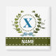 Une couronne de lierre délicate avec un ruban rayé bleu est superposée sur un fond blanc frais. La conception appropriée pour un mariage présente le monogramme "X" en bleu. L'aimant peut être personnalisé avec n'importe quel nom sur la bannière de ruban vert. Conseil de conception : pour la police affichée ici, utilisez des majuscules pour le nom.