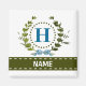 Une couronne de lierre délicate avec un ruban rayé bleu est superposée sur un fond blanc frais. La conception appropriée pour un mariage comporte le monogramme "H" en bleu. L'aimant peut être personnalisé avec n'importe quel nom sur la bannière de ruban vert. Astuce de conception : Pour la police présentée ici, utilisez des majuscules pour le nom.