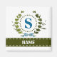 Une couronne de lierre délicate avec un ruban rayé bleu est superposée sur un fond blanc frais. La conception appropriée pour un mariage comporte le monogramme "S" en bleu. L'aimant peut être personnalisé avec n'importe quel nom sur la bannière de ruban vert. Astuce de conception : pour la police présentée ici, utilisez des majuscules pour le nom.